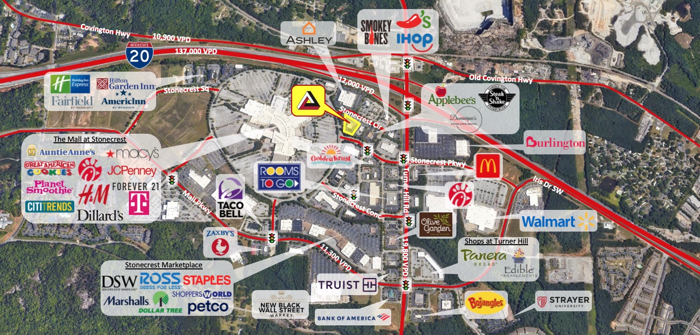 The property is close to The Mall at Stonecrest’s ring road, and has access to the signalized intersection at Turner Hill Rd and I-20.