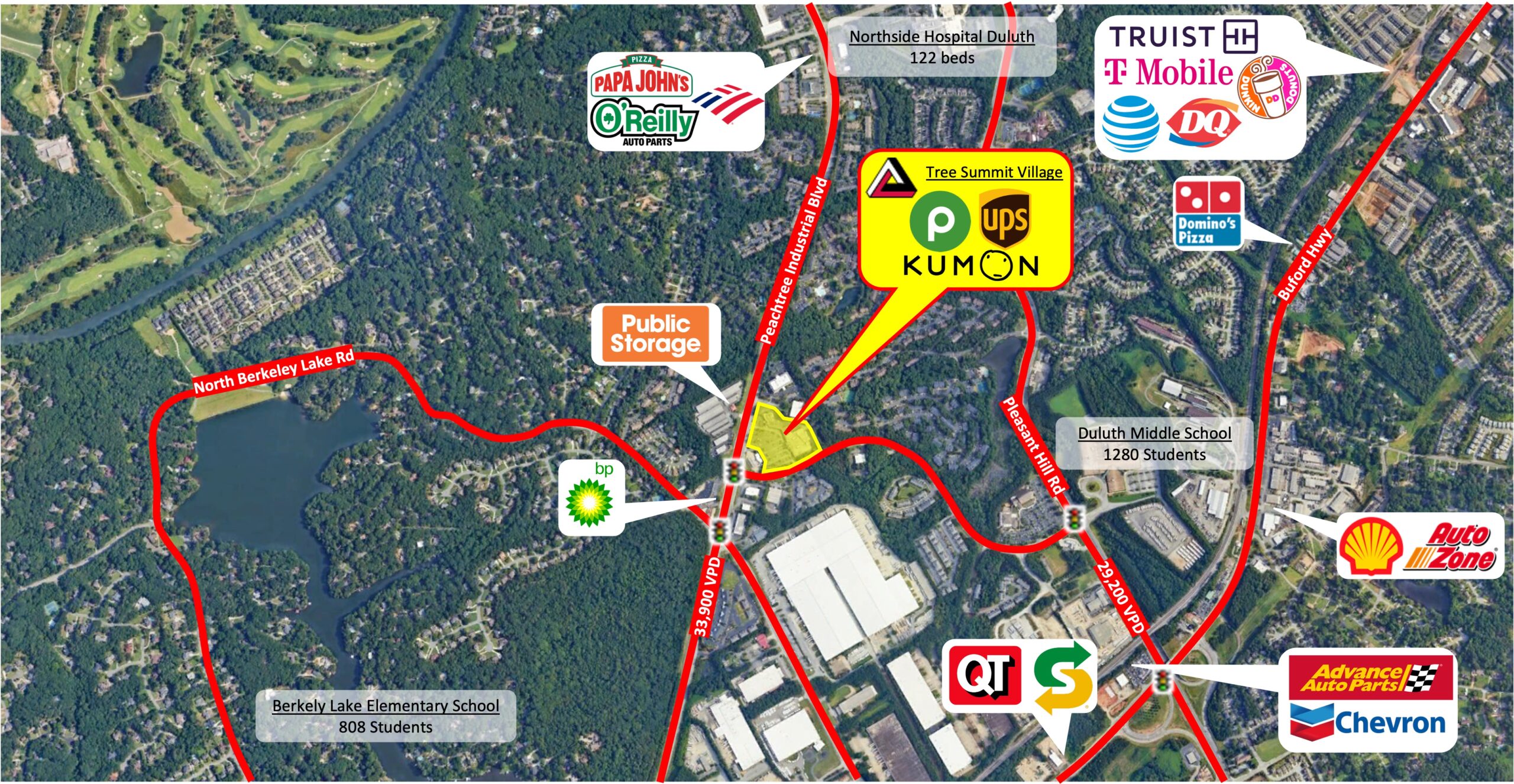 Tree Summit Village is located at the intersection of Peachtree Industrial Blvd (33,900 VPD) and Summit Ridge Pkwy.